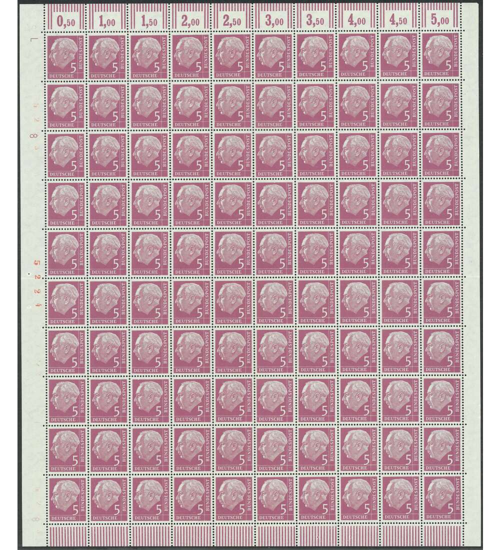 Im Jahr 1960 wurden 8 Heuss-Werte versuchsweise auf sogenanntem fluoreszierendem Papier gedruckt, auch Heuss Lumogen genannt. Dieser Satz (Nr. 179-260 y) ist Bestandteil jeder BRD-Sammlung. Auf Grund der Seltenheit wurden nahezu alle Bogen aufgetrennt um der enormen Nachfrage nach Einzelsätzen zu entsprechen. Ganz selten gelingt es also noch komplette Bogensätze zu erhalten. Aus einem Arzt-Nachlass konnten wir jetzt 2 Bogensätze in taufrischer postfrischer Luxusqualität erhalten, natürlich ungefaltet und mit den begehrten Druckerzeichen. Das Besondere: Völlig ohne die übliche Randbeschriftung durch Postbeamte! Etwas für höchste Ansprüche und auch zur Kapitalanlage! Michelwert ca. 8.000,- +++